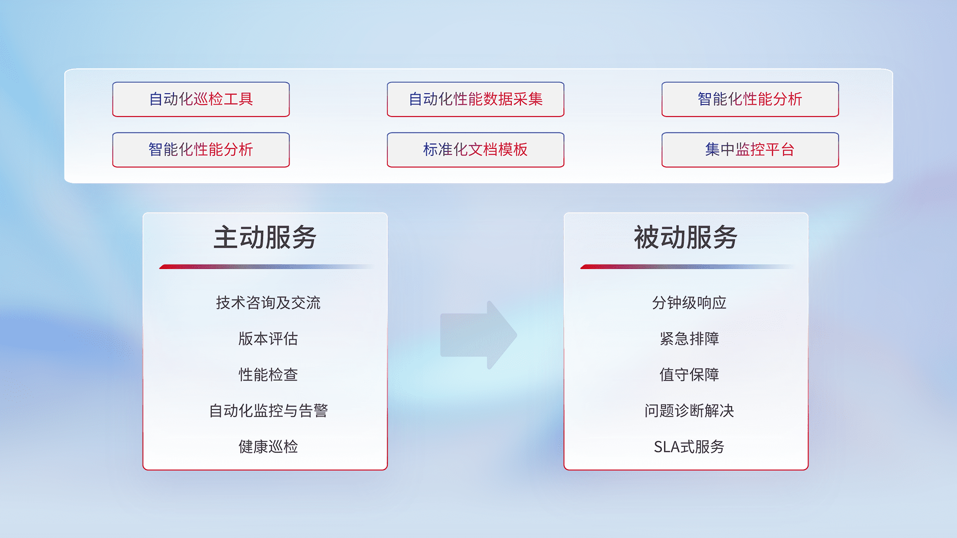 智能化工具和标准化文档,,,,保障服务质量,,提供主动服务(包含技术咨询、、、版本评估、、、、性能检查、、自动化监控与告警、、健康巡检)和被动服务包含(分钟级响应、、、、紧急排障、、、、值守保障、、、、问题诊断解决、、、SLA服务)。。